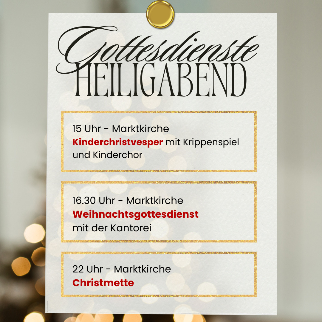 Heiligabend – Mittwoch, 24.12.2025, 15 Uhr, Marktkirche: Kinderchristvesper mit Krippenspiel und Kinderchor (Pfarrerin Birgit Schneider, Gemeindepädagogin Daniela Stüker, Kantorin Lea Lenart)